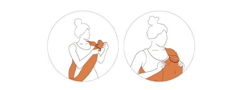– Sostene la cabeza de tu bebé con una mano y con la otra agarra el extremo superior de la tela, por donde está la costura, y deslízala hacia arriba para cubrir toda su espalda hasta la nuca o un dedo por encima de las orejas de tu bebé, no más.