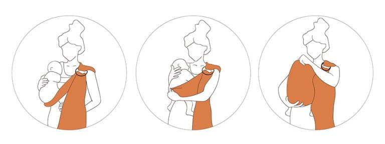 – Lleva la tela por detrás de sus rodillas y de a poco baja a tu bebé. La idea es que tu bebé se acomode sobre tu pecho con la tela atrás de las rodillas, como si fuese una hamaca.