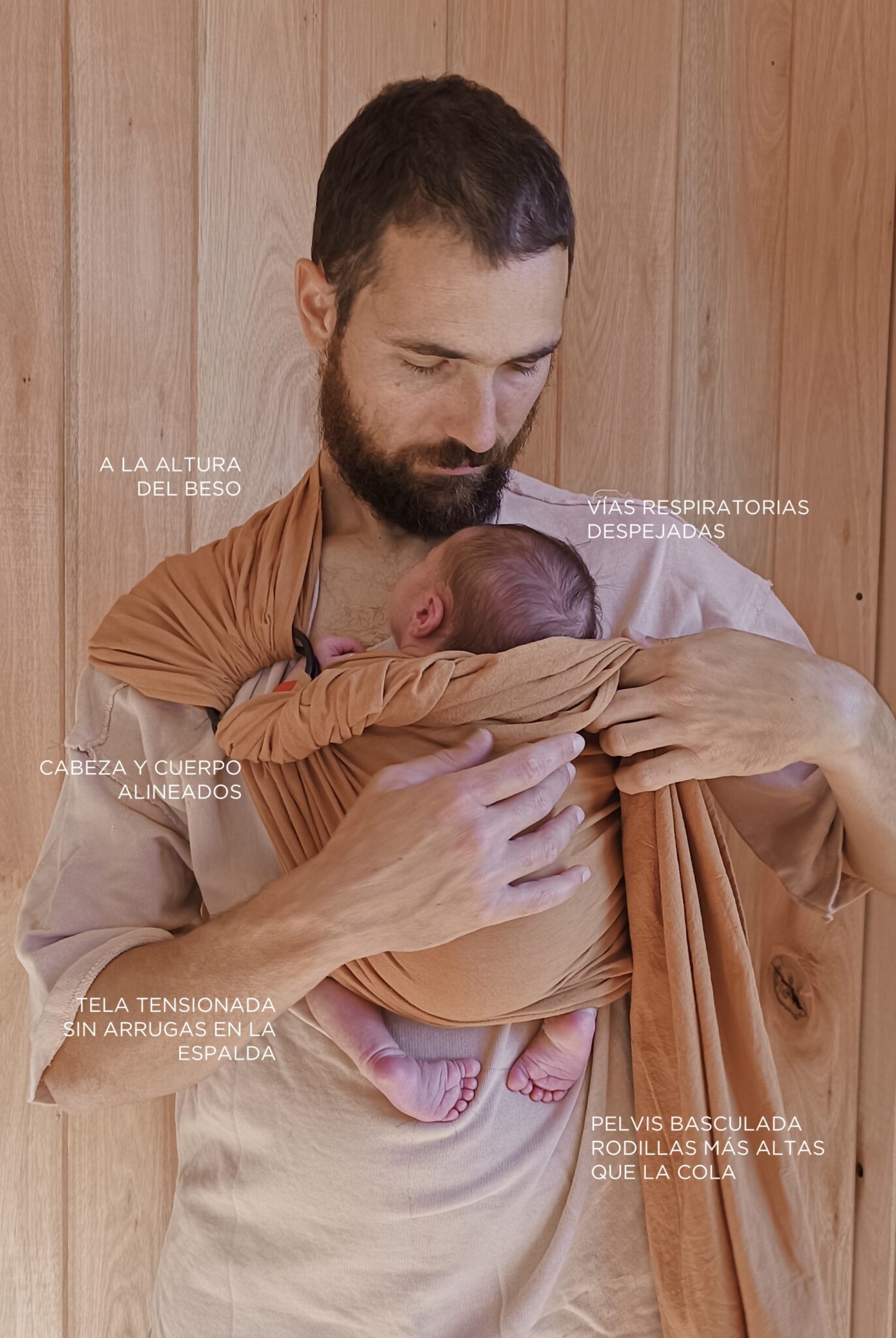 Conoce la posición ergonómica de referencia para portear a tu bebé de manera segura con la bandolera de anillas.